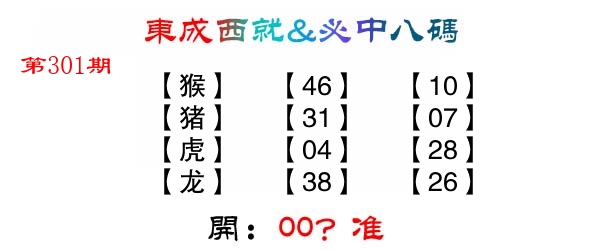 | 301期: ⑤肖 | 兔鼠猪蛇虎 | ????中 |